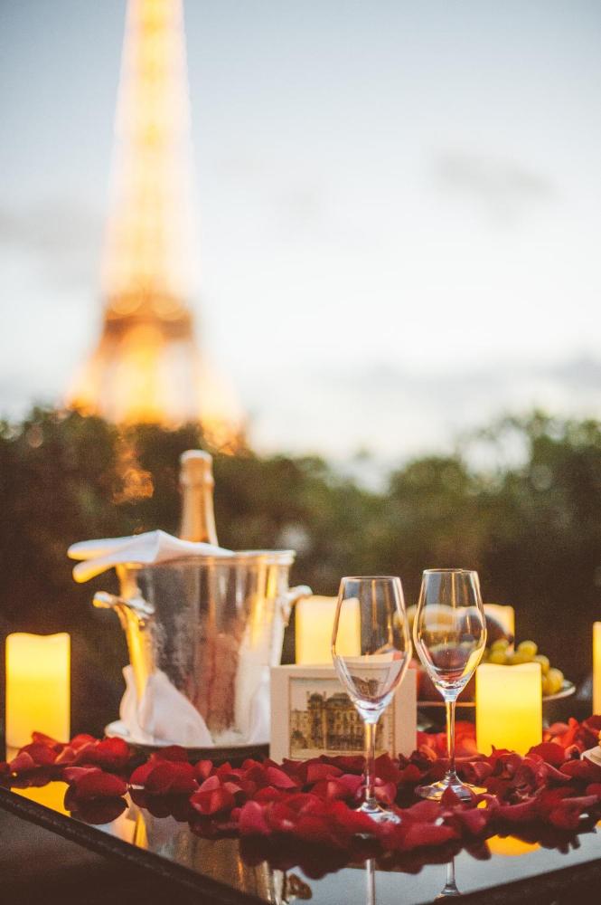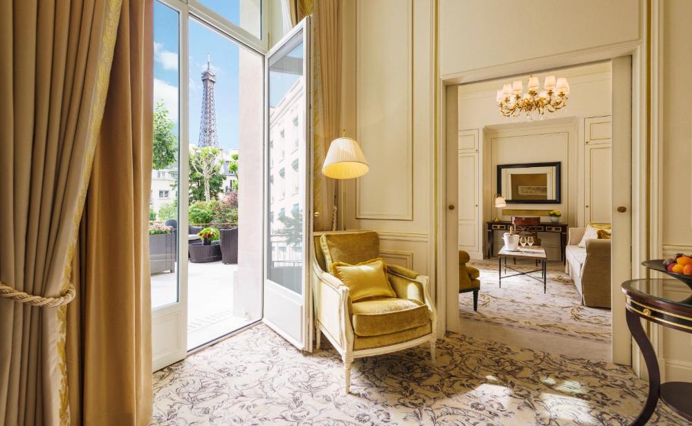 This double room features large windows opening to a private outdoor terrace and glimpses of the Eiffel Tower.